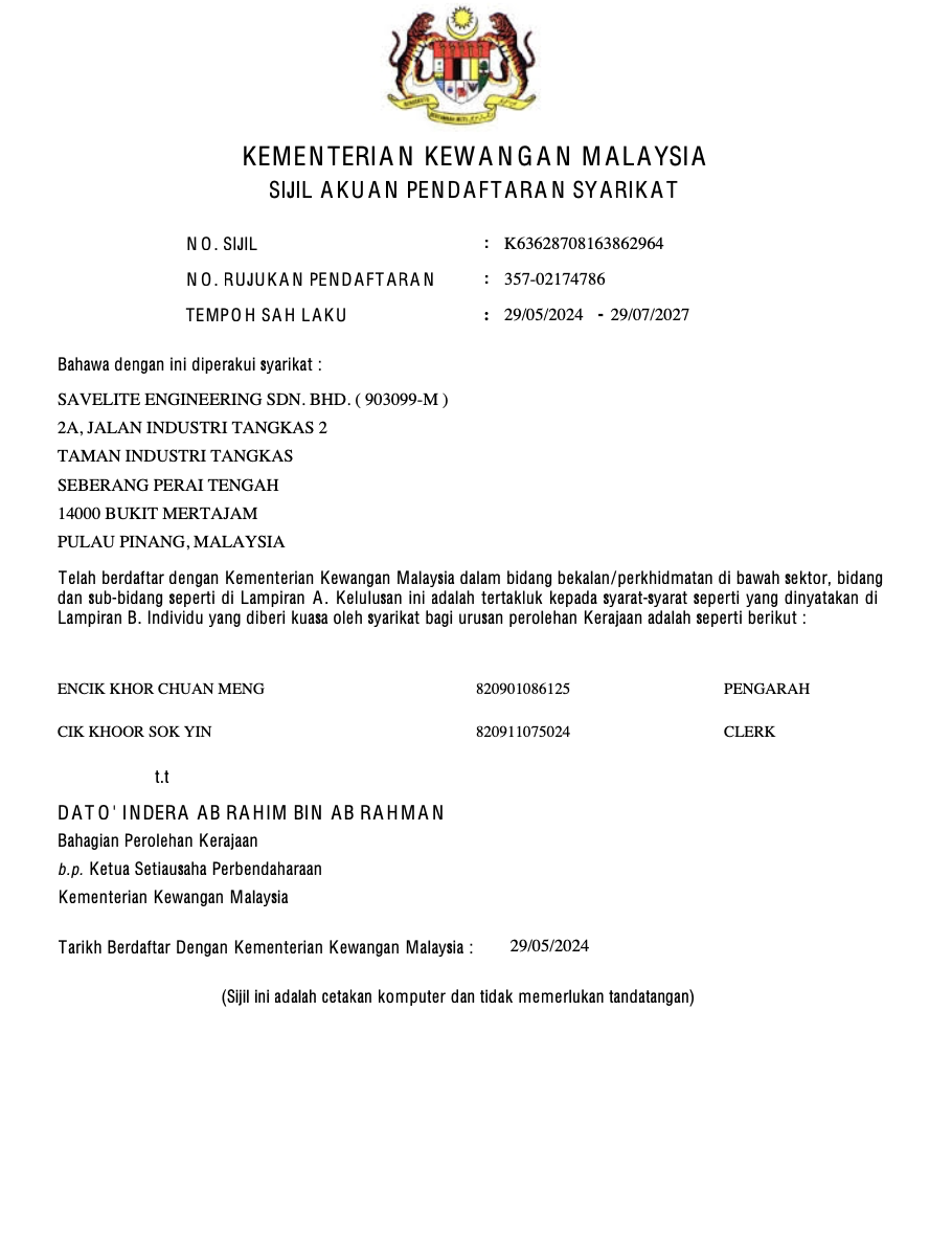 Kementerian Kewangan MalaysiaRegistration No. : 357-02174786Cod : 140301 – Kabel Elektrik Aksesori: 140302 – Wayar Elektrik Dan Aksesori